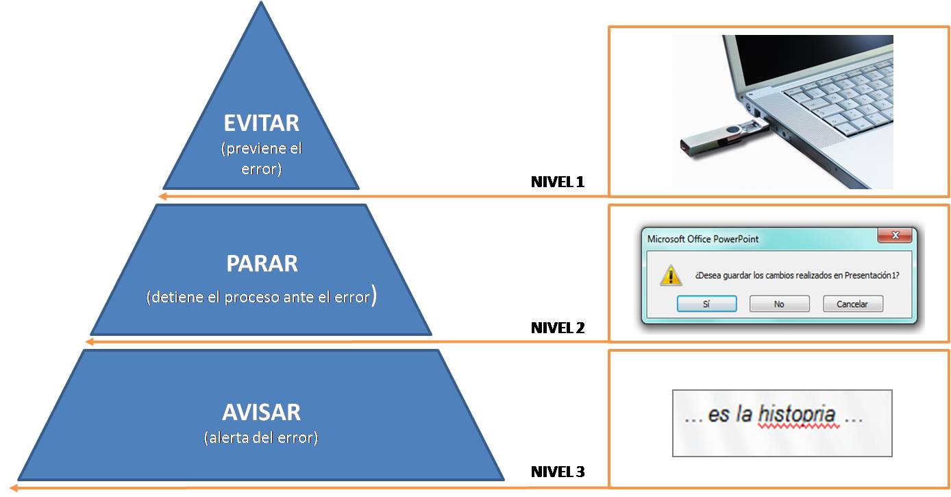- Nivel 1: sistemas donde el mecanismo físico evita que se cometa el error. Es el caso de los puertos USB, que su diseño obliga a que se conecte con la polaridad correcta.
